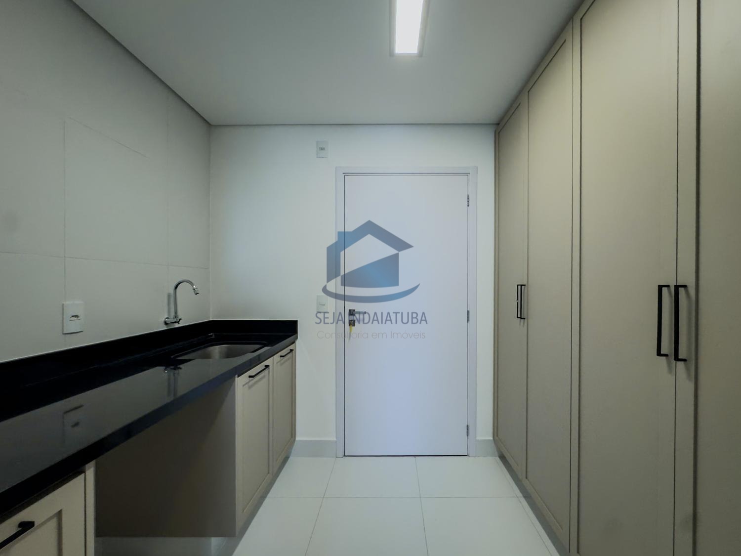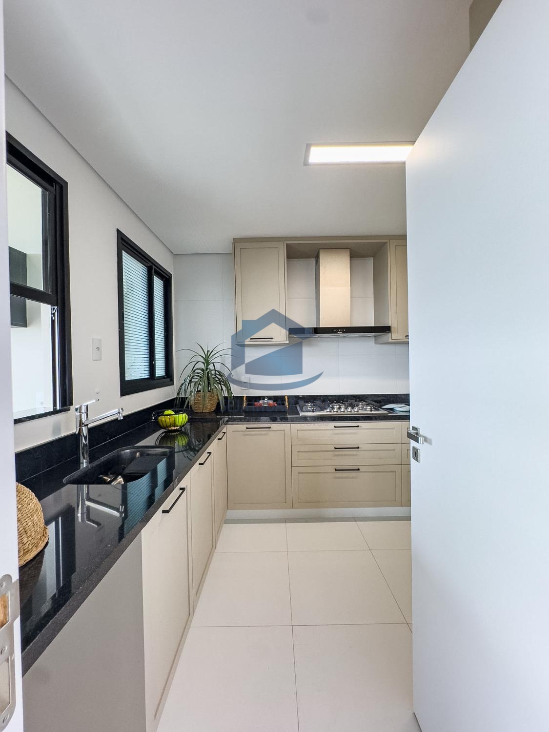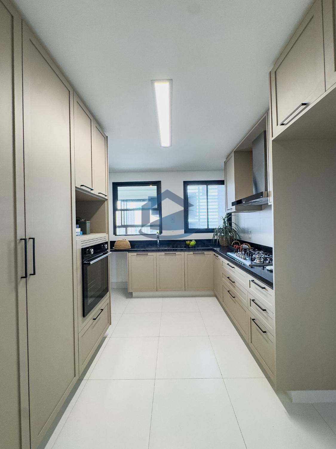 - Cozinha com móveis planejados, coifa, cooktop e forno