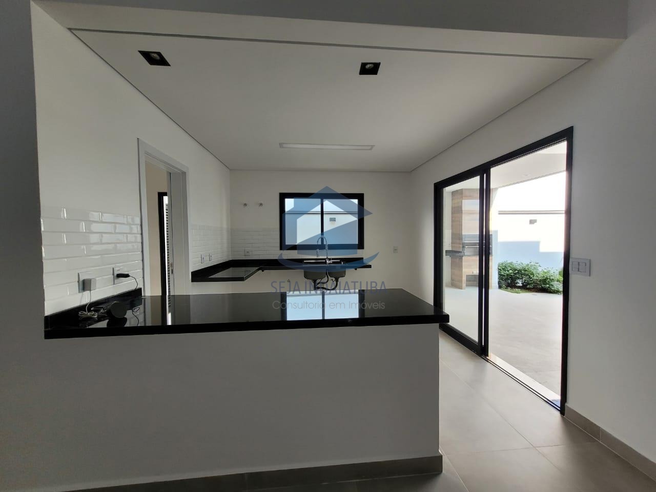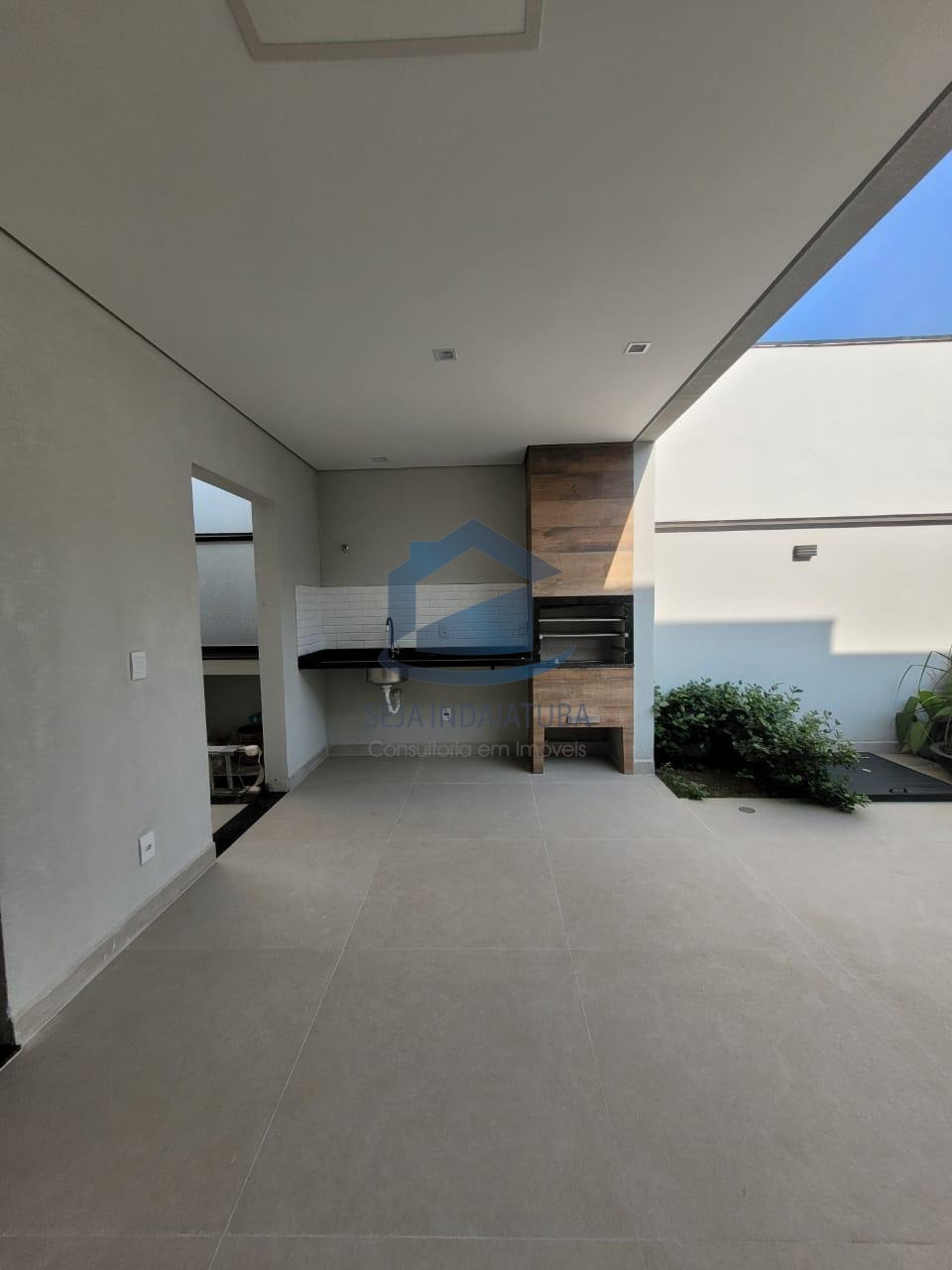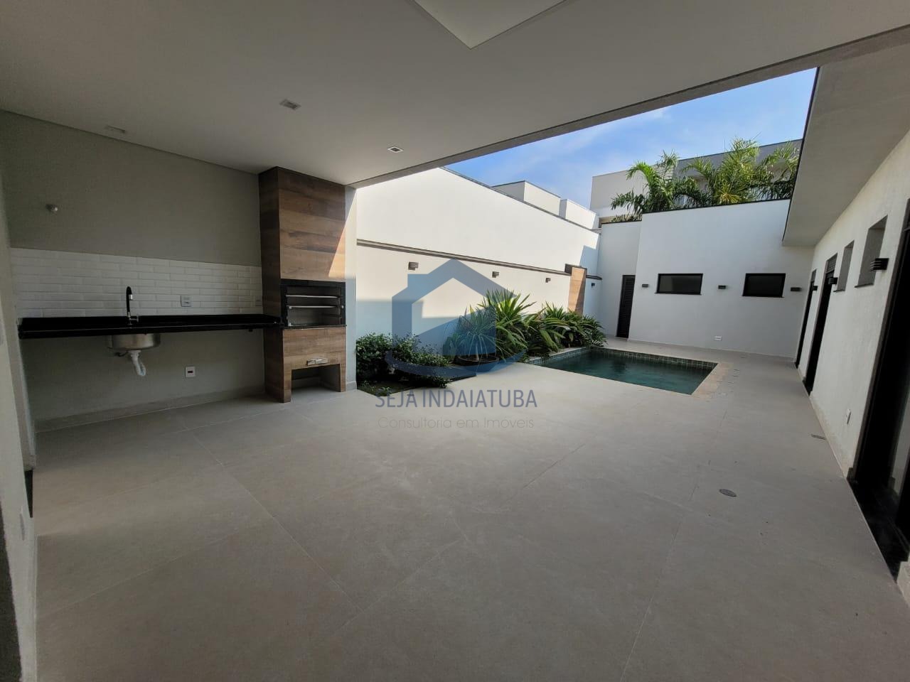 com churrasqueira revestida, sala de estar/jantar com pé direito de 4,80 m, piscina com