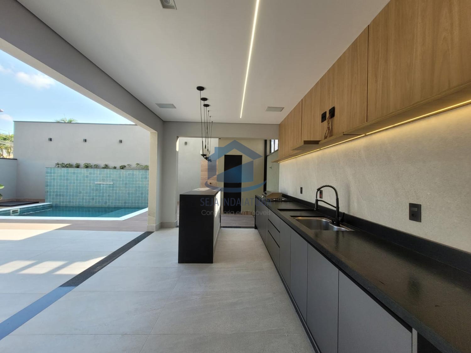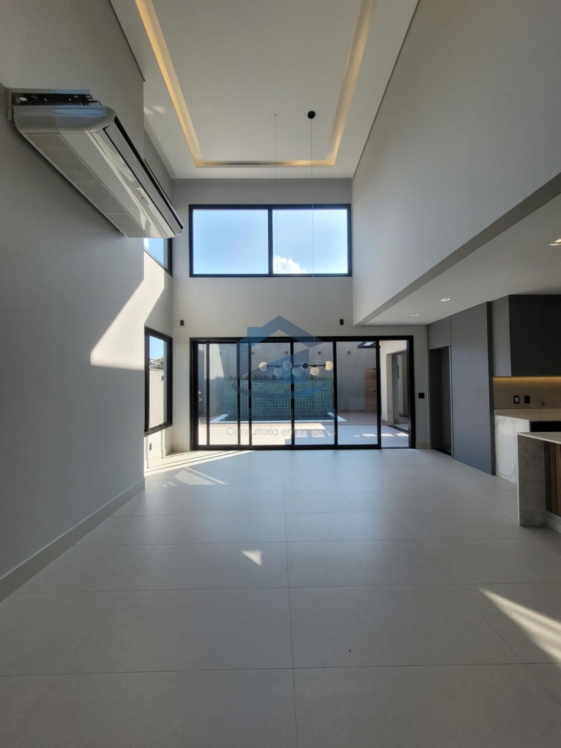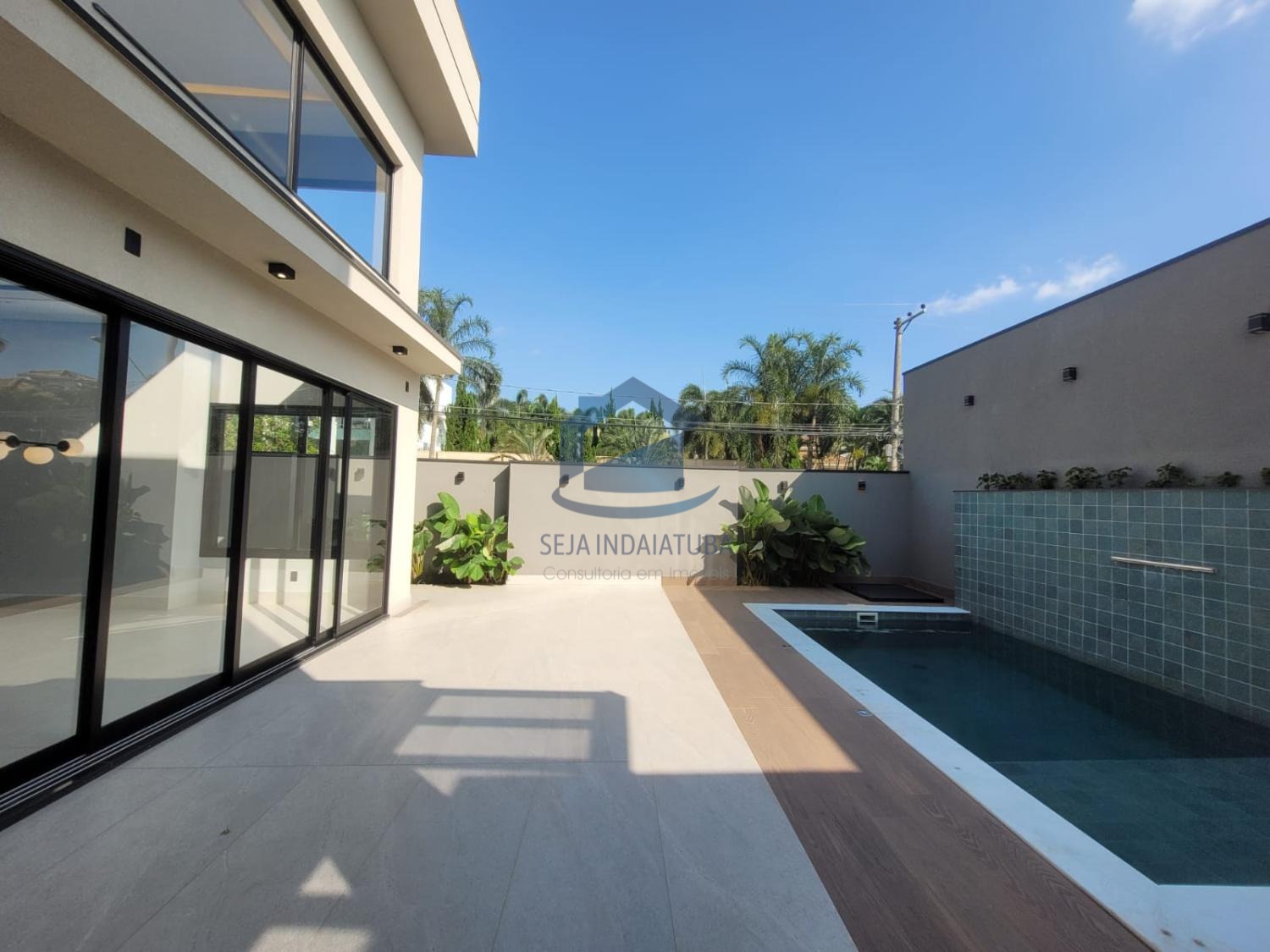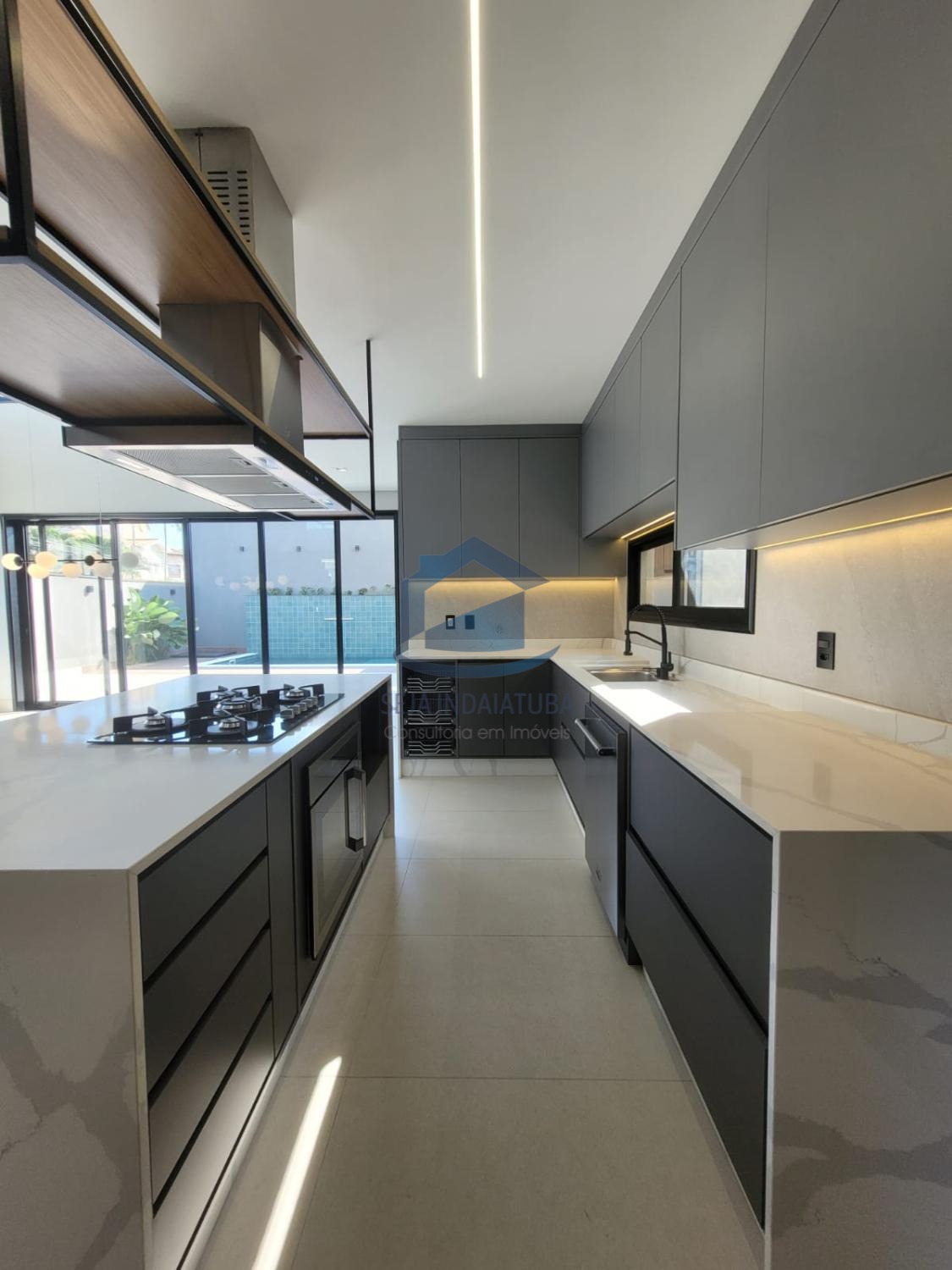 A casa possui 3 suítes, sendo duas delas com closet, e um acabamento de primeira qualidade com porcelanatos Portobello e iluminação em LED. Além disso, a casa possui planejados na cozinha, banheiros, área gourmet e nas suítes. Também conta com sistema de som nos ambientes via Bluetooth e Wi-Fi. Há uma piscina com cascata e iluminação em LED, área gourmet, 1 lavabo, sala e cozinha integrada, sala home, pé direito de 9 metros. A propriedade possui uma garagem para 4 carros grandes, com 3 vagas cobertas e 3 descobertas.