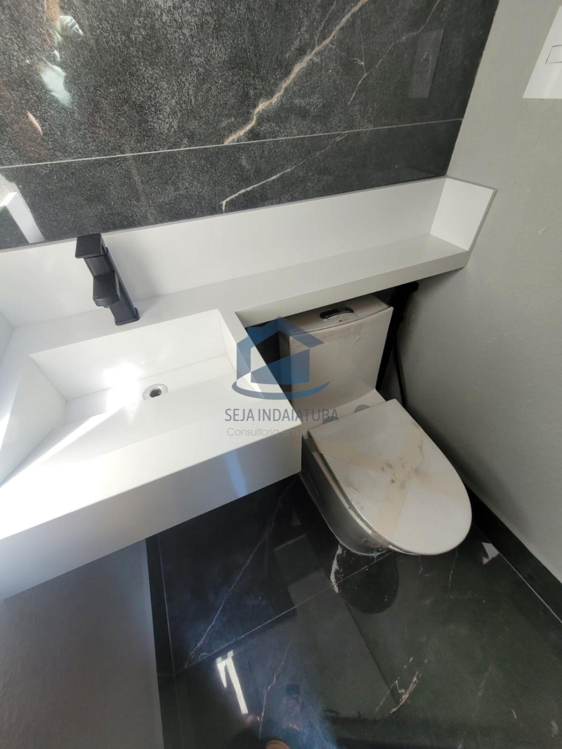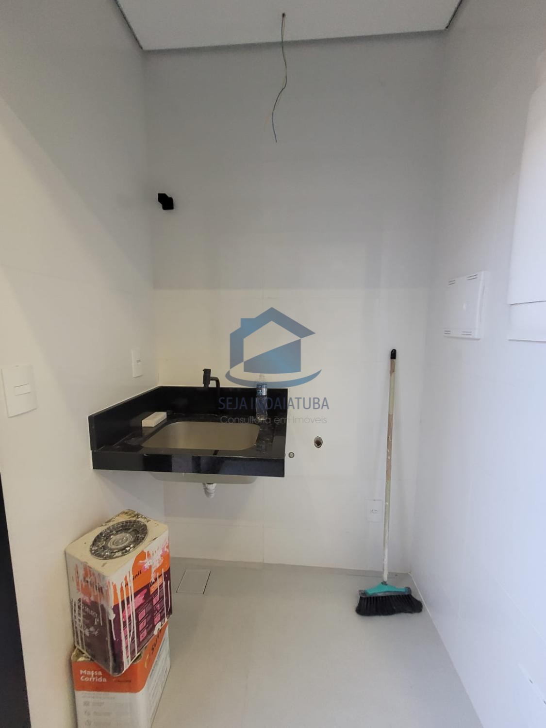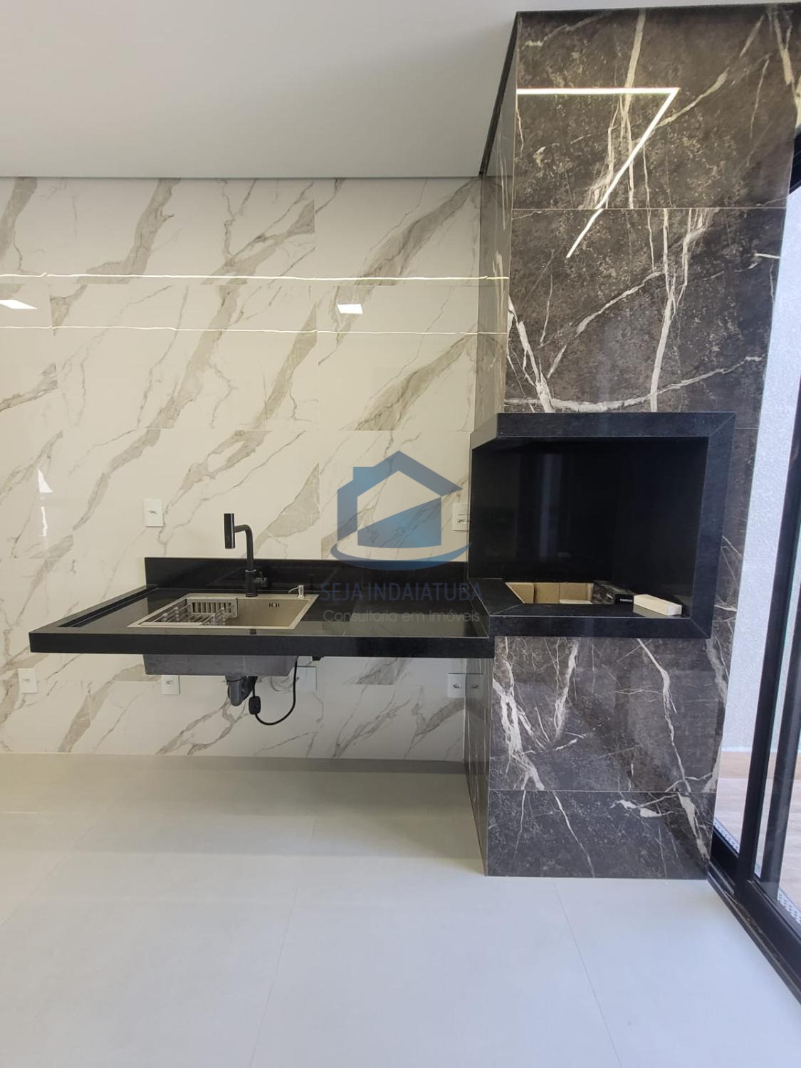 -Pia e balcão da cozinha em quartzo branco estellar, banheiros em branco prime, soleiras e pia gourmet em preto São Gabriel.