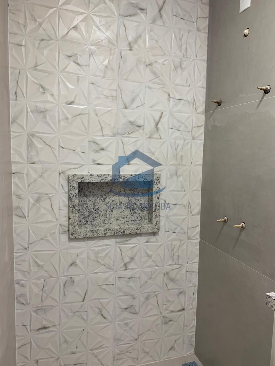 Banheiro social e da suíte com box instalado com esquadrias na cor preta seguindo a padronização das esquadrias da casa.