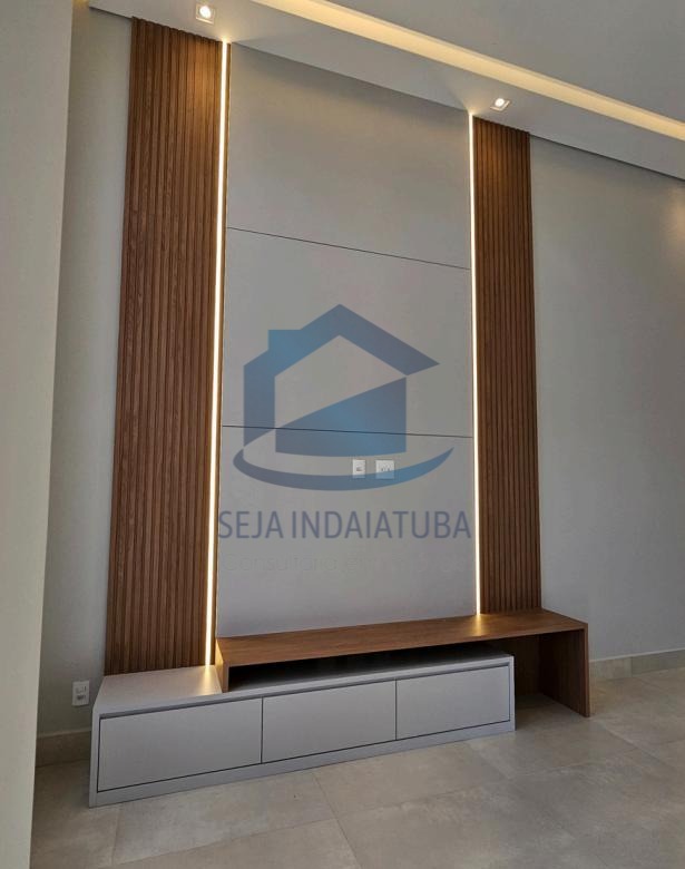 Painel de TV planejado já instalado, com 4.80 metros de altura, acompanhando o pé-direito da sala.