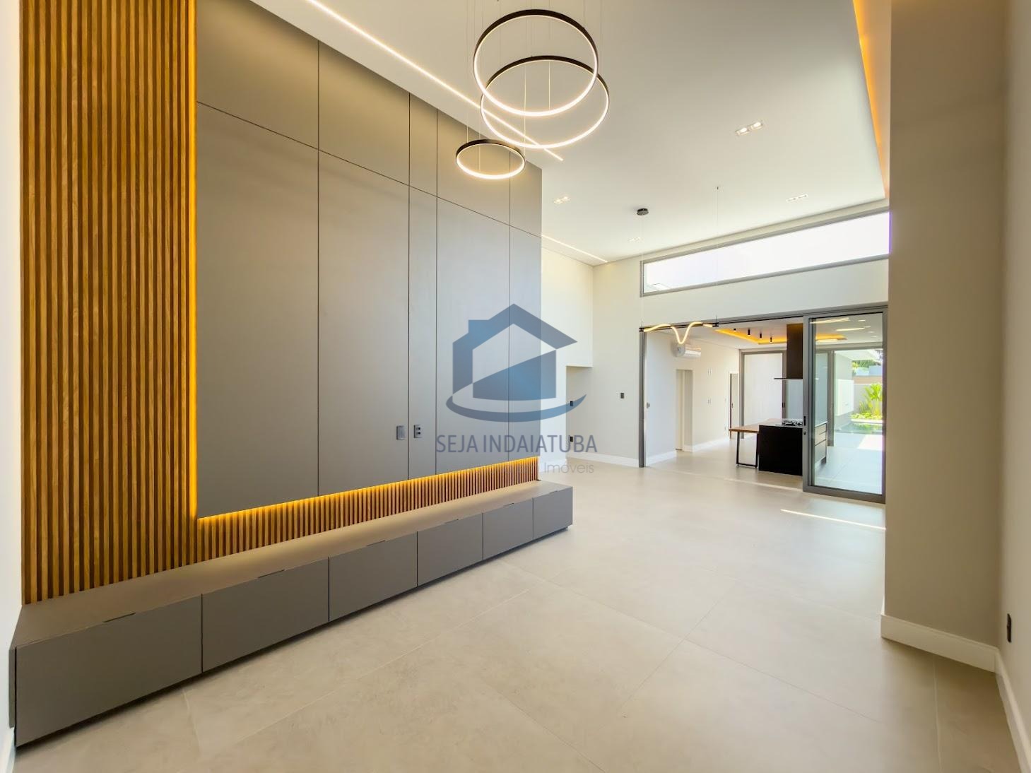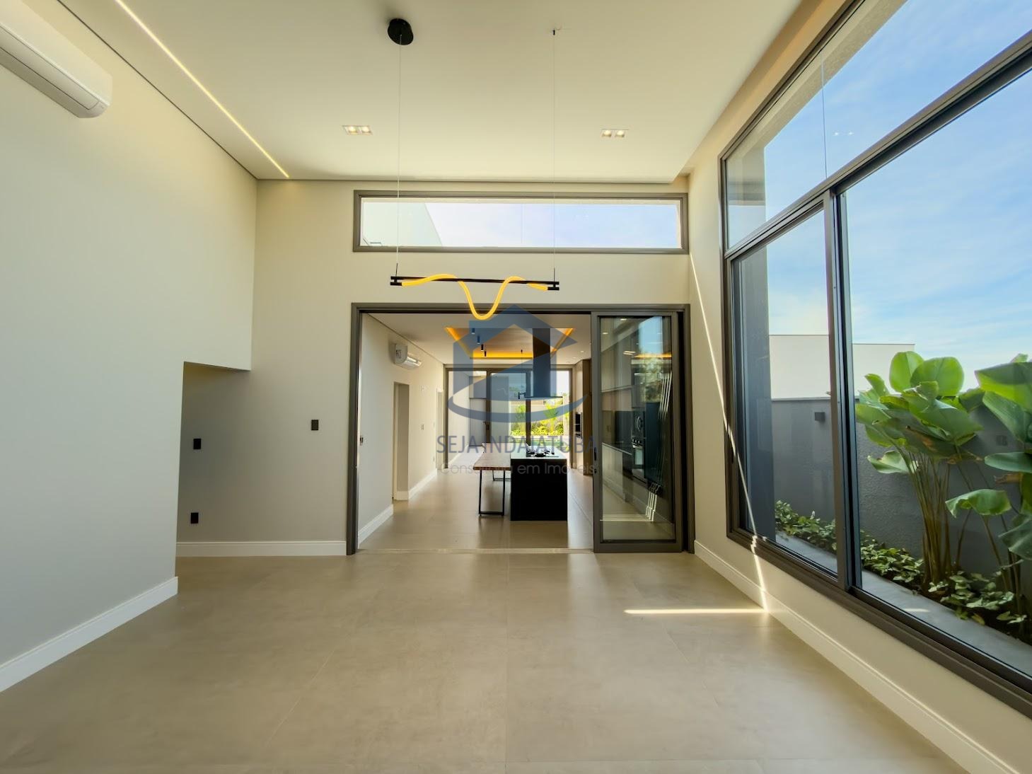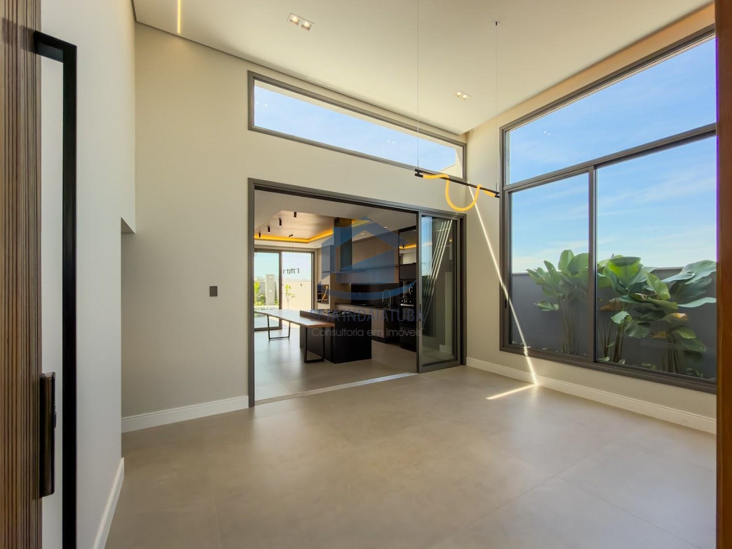 Sala de estar e sala de jantar com pé direito alto integradas a cozinha